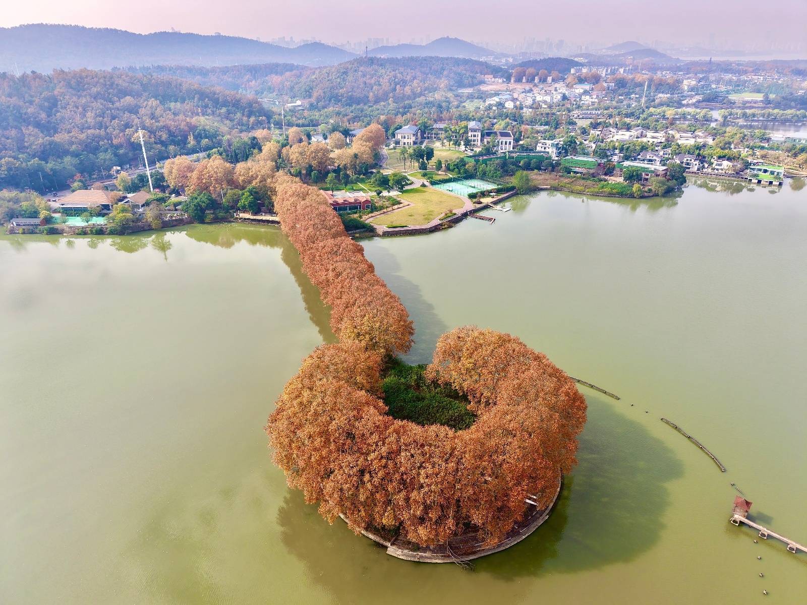 从空中俯瞰,东湖绿道团山驿站旁的湖心步道如一把金灿灿的“钥匙”伸入湖中——狭长的步道两侧梧桐树叶色彩斑斓,尽头圆形区域被金黄树木环绕,与碧波湖水相映成趣,构成一幅绝美的秋日画卷。