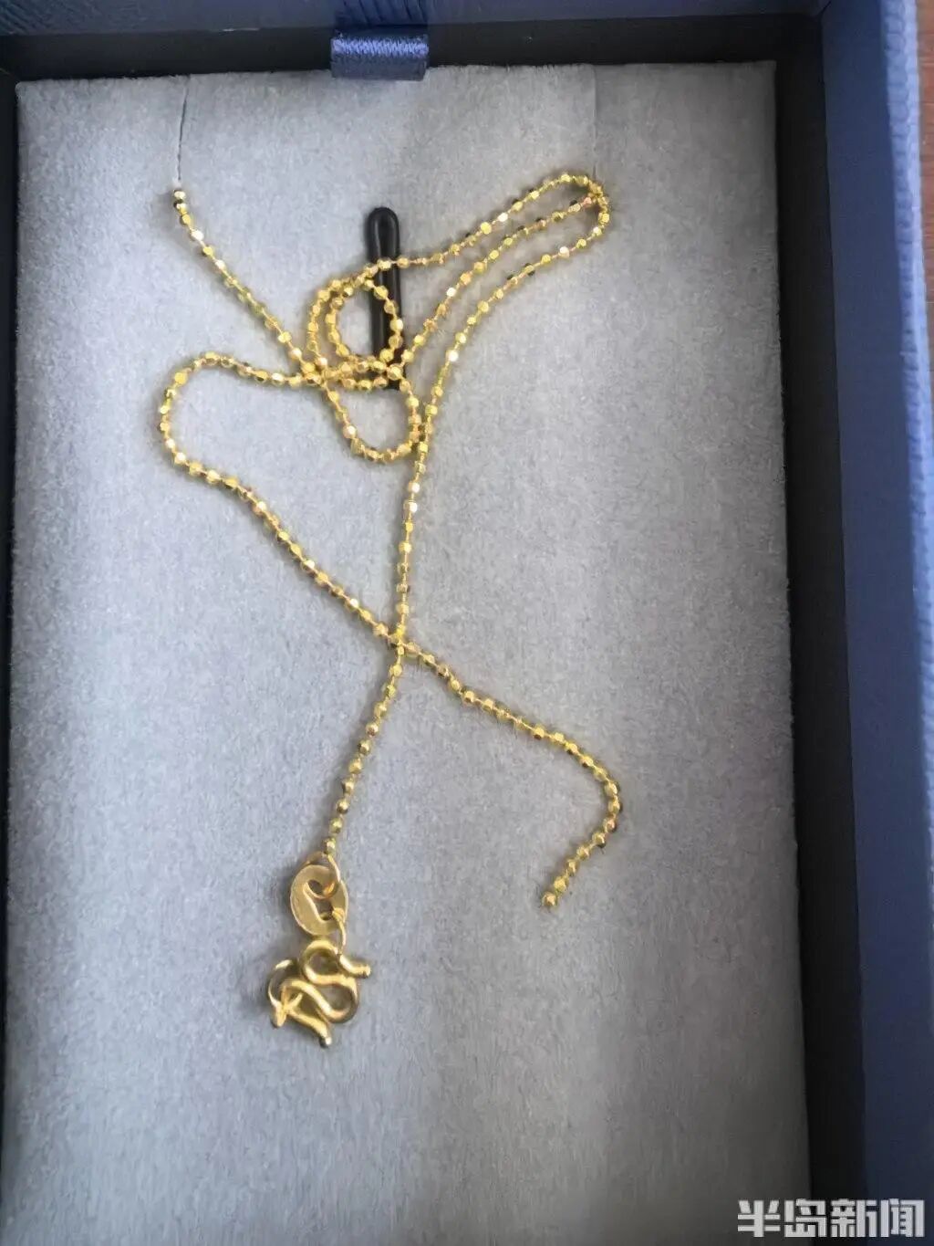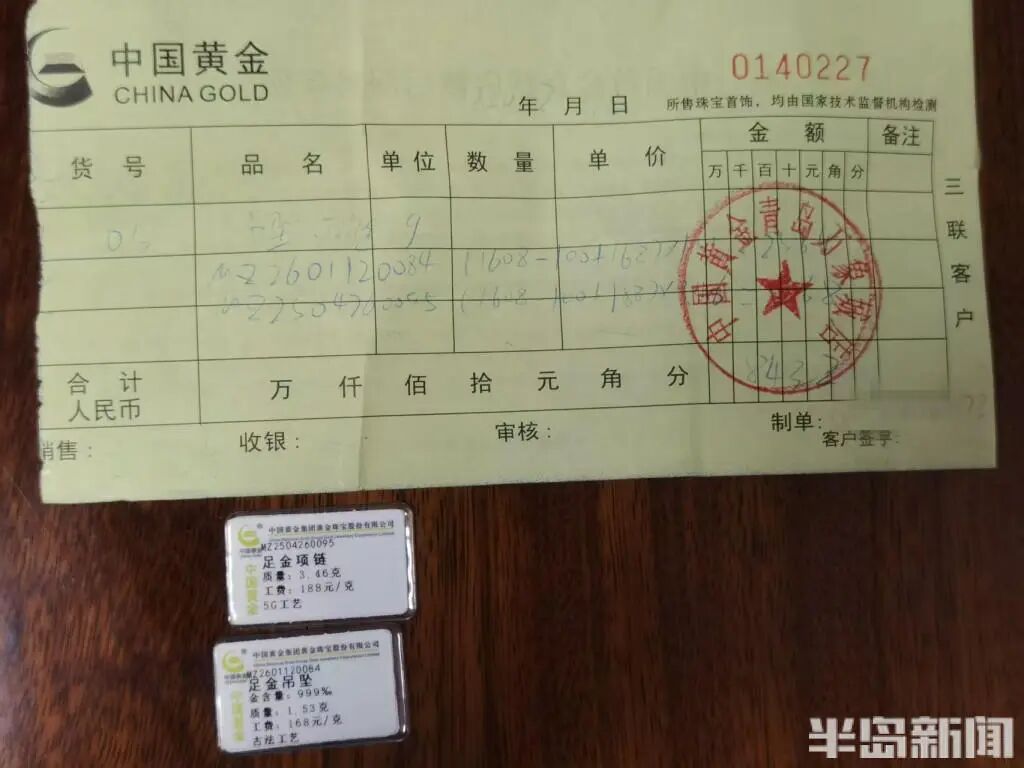 据江女士介绍,今年2月28日,她对象在中国黄金这家店购买了一条珠链样式的足金项链,质量为3.46克, 加上每克188元的工费,项链共计花费5868元,另外还购买了一个价值2564元的足金吊坠,共花费了8432元。“当时买这个黄金首饰,主要想送给我作为‘三八’节礼物的。”江女士说,由于自己当时并不在青岛,购买以后,首饰带着原包装被放置起来。等到3月7日,其对象把首饰带到了济南,当面送给了江女士。等打开要佩戴时两人才发现,“项链不知道什么时候断裂成两截了”。